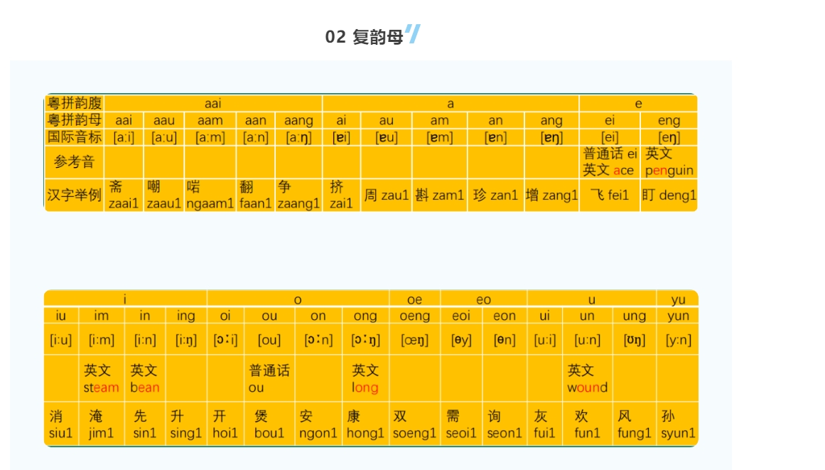 , [l] 音分明;所有非元音开头的字,均冠以声母 [ŋ] ,珂 [ŋɔ1] ,矮 [ŋɐi2] ,亚 [ŋa3] ,爱 [ŋɔi3] ,恶 [ŋɔk3] 。